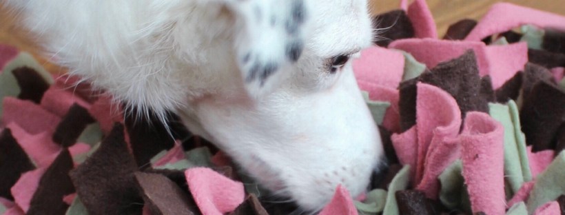 Deze keer een DIY voor mijn trouwe viervoeter Dory, namelijk: De snuffelmat! Dat is een matje waar je hondenkoekjes en -snoepjes in kunt verstoppen. Tijdens dit soort ‘braingames’ moeten honden actief op zoek gaan naar eten, door hun neus te gebruiken. Wist je dat 5 minuten snuffelen qua intensiteit gelijk staat aan een wandeling van een halfuur?* Daarnaast vermindert het stress en gedragsproblemen. Een ontspannend spelletje met een lekkere beloning dus en het is mentaal nog een flinke uitdaging ook!