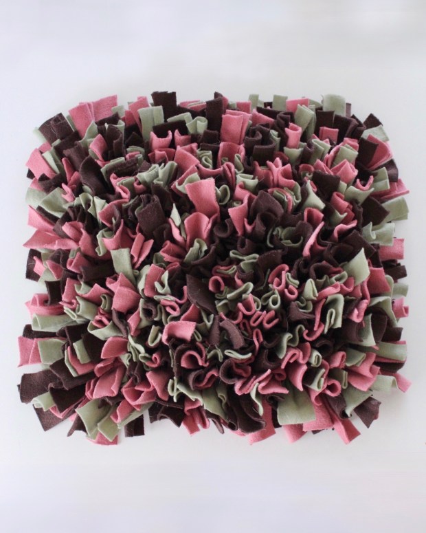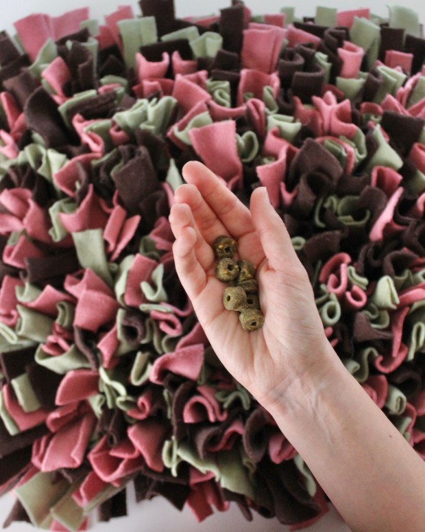 This time a DIY for my four-legged friend Dory, namely: The snuffle mat! That is a mat where you can hide dog biscuits and treats. During these ‘brain games’ dogs have to actively search for food by using their nose. Did you know that 5 minutes of sniffing is equivalent to a walk of half an hour in terms of intensity? A relaxing game with a nice reward and it is mentally quite a challenge too!