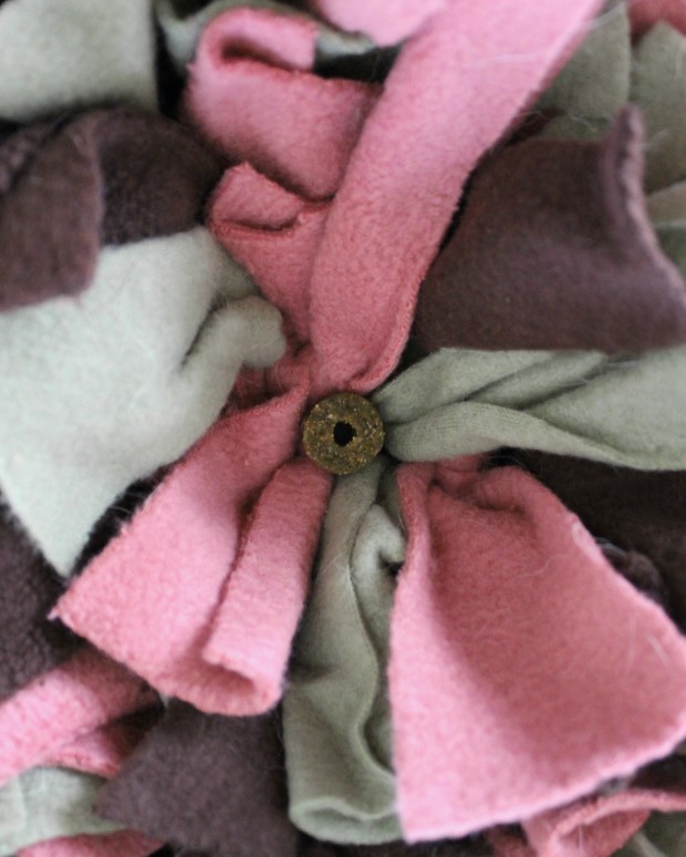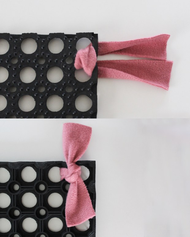 - Turn the ring mat upside down and push the ends of a fleece strip through two different holes. Then turn the mat back over again and tie a double knot in the fabric. Repeat this for the entire row. My ring mat is from Gamma and 40cm by 60cm.