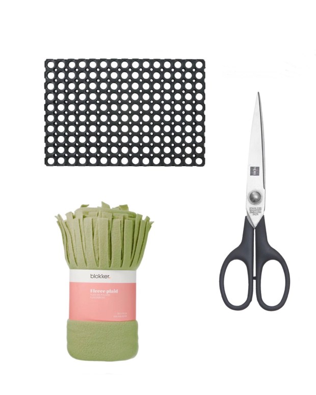 - Leg de ringmat op zijn kop en duw de uiteindjes van een fleecereep door twee verschillende gaten. Keer de mat vervolgens om en leg een dubbele knoop in de stof. Herhaal dit voor de hele rij. Mijn ringmat is van Gamma en 40cm bij 60cm.