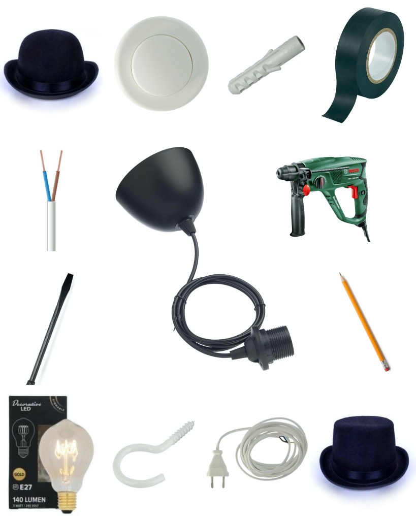 During a dinner at Broadway, one of our favorite restaurants at the Oudegracht in Utrecht, my boyfriend and I saw such a cool idea: Lamps made from a top hat and a bowler hat! Simple yet original. We had been looking for a nice lamp to hang above his reading chair for months, so we couldn’t wait to start with this new project!