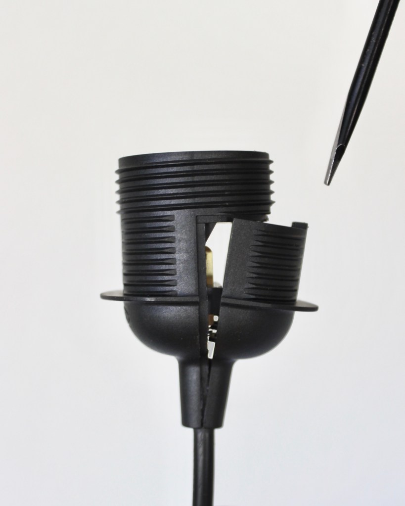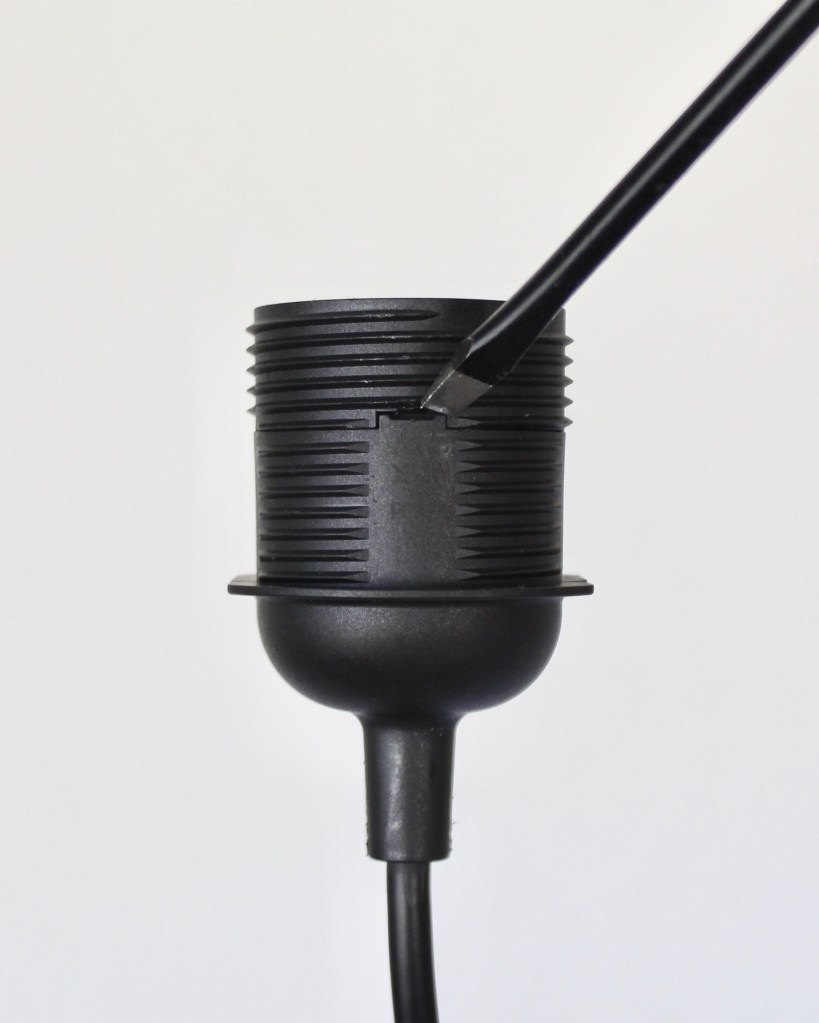 - Carefully open the lamp socket with a flat head screwdriver and take out the power cord. My pendant light cords came from Ikea.
